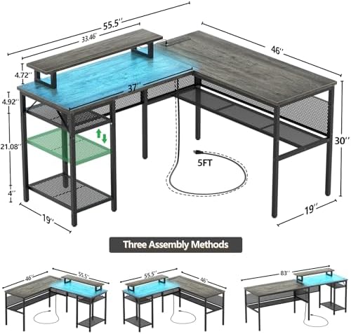 【MAGIC POWER OUTLETS AND FLEXIBLE MONITOR STAND 】The flexible monitor stand of l shaped desk allows for more spaces and helps to reduce your neck strain with a better sitting posture by providing an ergonomic sight level. The corner computer desk is built in 4 power outlets and 2 USB charging ports. It provides extra power support for your computer, printer, scanner, phone, tablet, gaming gear etc, which provides a great convenience to your life when you are working, writing or playing games.