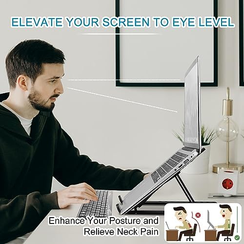 2.Easily Adjustable Laptop stand: Our computer stand boasts a 10-level height adjustment, catering to various user heights for optimal typing and viewing comfort. Ideal for both business travelers and coffee shop professionals. Versatile stand accommodates tablets, music scores, and books. Its sleek black design exudes style and simplicity, adding a touch of elegance to your setup. computer stand for laptop/dj laptop stand/laptop riser for desk/macbook pro stand/laptop holder/macbook air stand