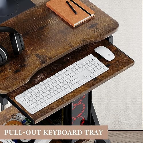 Small Computer Desks with Power Outlet, Z-Shaped Home Office Desks for Small Space, Compact Study Desk with Keyboard Tray and Casters, Computer Workstation for Home and Office, Brown