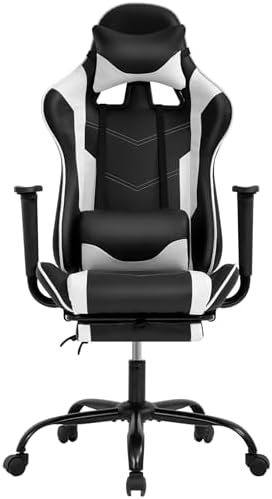 🎮Modern Design: Enhance your space with a sleek black and white gaming chair featuring an unique appearance, headrest, full armrests, and a padded leg rest. Ideal for a stylish and comfortable setup.