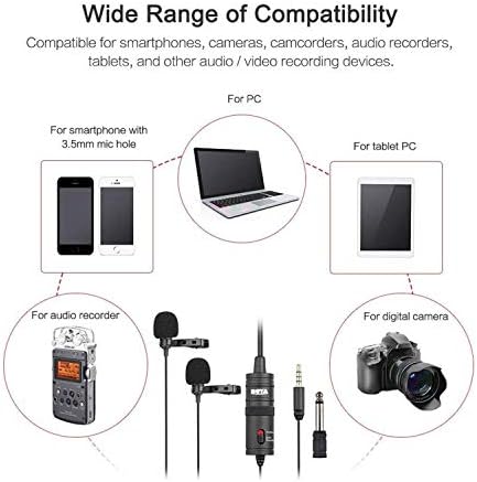 Dual lavalier universal microphone with a single 1/8 stereo adapter, designed for IOS and android smartphones, DSLR cameras, camcorders, pc, audio recorder, etc