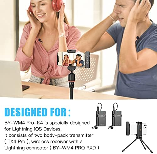 ❤ Designed for iPhone iOS Devices — BOYA Wireless Microphone BY-WM4 PRO K4 consists of two body-pack transmitters (TX4 Pro), one wireless receiver with a Lightning connector (BY-WM4 PRO RXD), two omnidirectional lavalier microphone.