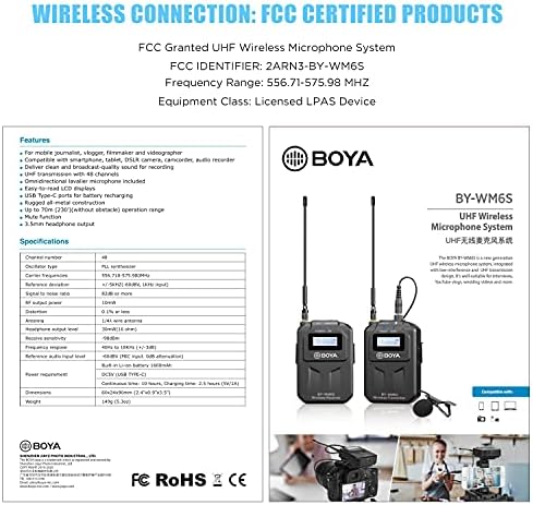 Specifications of BOYA UHF Wireless Lavalier Microphone BY-WM6S