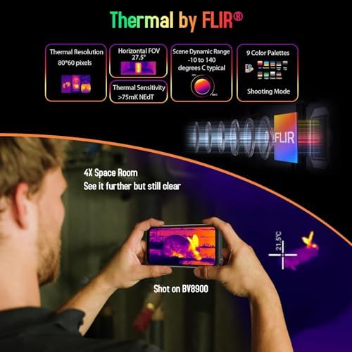 📷【FLIR Thermal Camera】📷This rugged phone BV8900 has has thermal imaging capabilities powered by the latest FLIR Lepton.The rugged smart phone has unique upgraded features with 9 palettes of thermal imaging shooting modes including a 4x spatial zoom through high thermal resolution, easily finding hot spots, assessing risk and tracking temperatures. Enhanced thermal image detail provides precise temperature insights to help electrical repairers quickly diagnose problems. It’s ideal for outdoor enthusiasts to help with survival and rescue missions, and a great home helper to pinpoint home plumbing problems and reduce maintenance costs.