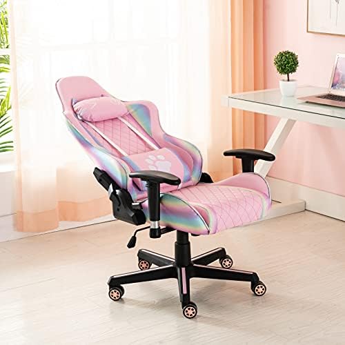 Inspired by kitty cat, this cute gaming chair is only only a good looking piece, but also an ergonomic gaming chair that can support you all day long. You can have a rest on our computer chair when you feel tired cause it can recline to 170 degrees. Removable headrest and lumbar support to protect your waist and neck. Enjoy ergonomic designed High-back gaming chair office racing style chair to work, relax and sit comfortably for long sessions of gaming and working. FEATURES: Product Type: PC & Racing Weight Capacity: 300 Pounds Upholstery Material: Faux leather Base Finish: Black Base Material: Metal Tilt Base: Yes Adjustable Height: Yes Reclining: Yes Lumbar Support: Yes Pillow Included: Yes Ergonomic: Yes Vibration: No Armed: Yes Armrest Type: Adjustable Adjustable Headrest: Yes Speakers: No Product Care: Wipe clean with a dry cloth Back Material: Upholstered Frame Color: Black Headrest Included: Yes Seat Material: Upholstered Swivel: Yes Tilt Mechanism: Yes Upholstered: Yes Upholstery Fill Material: Foam Country of Origin: China